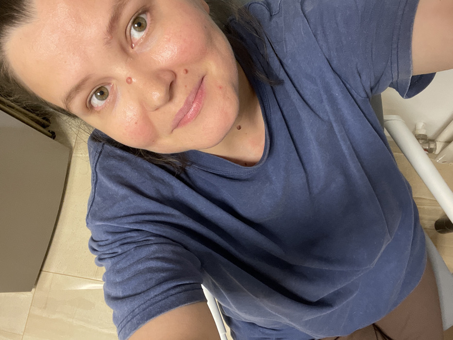 A forensic examination of the image reveals a medium-angle, high-perspective selfie of an adult female in an indoor setting. The individual, appearing to be in Jinshui District, China, has fair skin, light-colored eyes, and unstyled dark hair. She wears a faded blue short-sleeved t-shirt and light brown or beige shorts. Her face exhibits a slight smile, with visible skin blemishes including a prominent circular lesion on her nose and multiple moles. Her cheeks appear flushed. The background consists of light-colored tiled flooring with visible grout lines. In the upper background, a segment of a large, light-grey or off-white object is partially visible. Along the bottom edge of the frame, white pipes are discernible, one featuring a metallic valve. The subject directly engages the camera lens.