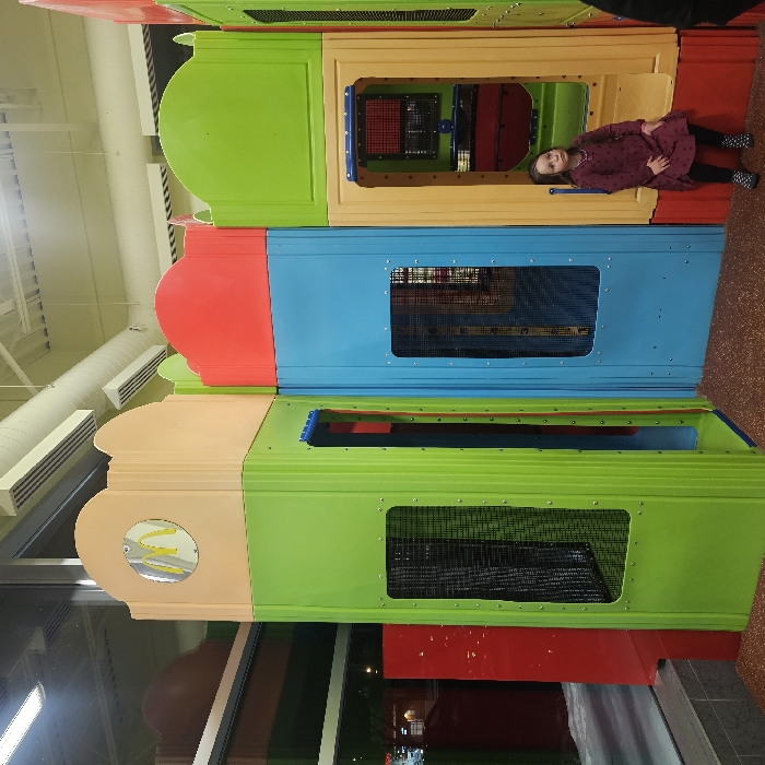 A child in a red dress lies in a McDonald's playground structure. The structure is made of colorful plastic panels, with green, yellow, red, and blue sections. Each section has a window with a black mesh. The playground sits on a red surface, and there are air vents on the ceiling above. Outside, there is a window reflecting the interior. The McDonald's logo is visible on one of the panels.