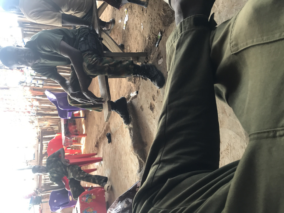 The image depicts an indoor scene within a rustic structure in Bwari, Nigeria, featuring at least four individuals. The perspective is from the lap of an unseen person, whose olive-green pants fill the lower foreground. To the left, a male in full camouflage uniform, including a t-shirt and trousers, sits casually in a red plastic chair, his feet clad in light-colored sandals. In the mid-ground center, another male in an olive-green t-shirt, camouflage trousers, and black combat boots sits on a wooden bench, looking directly towards the camera. His left foot rests on a wooden plank. Adjacent to him on the right, a partial view of a third male in a light-colored shirt is visible, also seated on the bench. The floor is an uneven dirt surface, marked with footprints and scattered debris including a black object, a white object, and pieces of paper or plastic. The background shows more red and purple plastic chairs and small tables covered with patterned tablecloths. The walls appear to be constructed from vertically arranged wooden sticks or bamboo, and various small packaged items hang from an overhead structure, possibly suggesting a small shop or informal eatery.