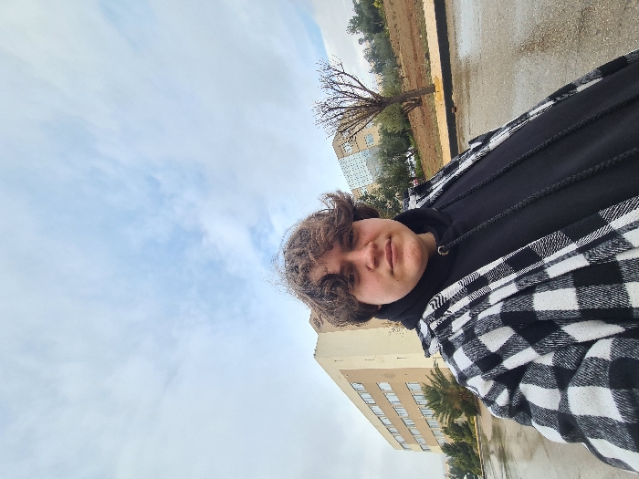 A person with curly brown hair wears a black hoodie and a black and white plaid jacket. Buildings are visible in the background, along with a bare tree and a cloudy sky. The ground appears wet. The photo seems to be taken from a slightly low angle, tilted to the side.