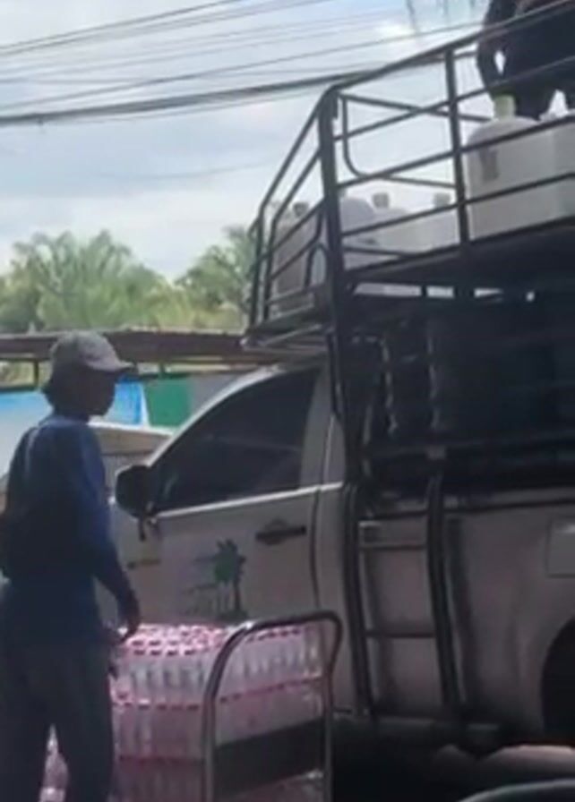 Two men are unloading cases of water bottles from a white pickup truck that has a black metal cage installed to expand its cargo capacity. One man is on top of the cage and throwing down cases of bottled water to the second man. The second man catches the cases and places them on a rolling metal cart loaded with additional cases of bottled water. In the background there are trees, power lines, and buildings. The truck has a logo with a palm tree and the word “Sanya” on the door.