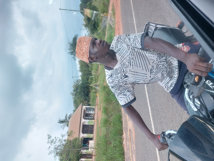 An outdoor scene in the city of Unknown, Tanzania, is depicted under an overcast sky. A dark-skinned adult male is seated on a black TVS motorcycle on a paved road. He wears a light-colored short-sleeved shirt with a black geometric pattern, dark trousers, and a light brown woven cap. His hands are positioned on the motorcycle handlebars, and his gaze is directed towards the right. In the left background, a single-story building with a light brown roof and white and green walls, resembling a small commercial establishment, is visible beyond a grassy verge. The environment includes a paved road surface, green grass, power lines, utility poles, and dense green vegetation, including palm trees. An object with a red emblem, potentially an Arsenal FC logo, hangs near the motorcycle's seat.