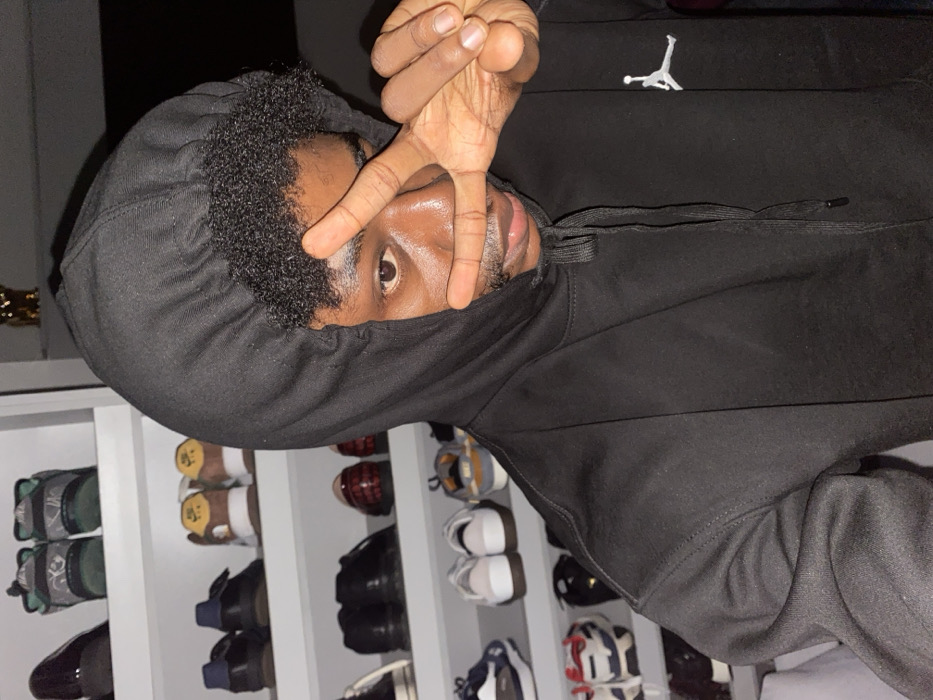 The scene depicts an individual inside what appears to be a private residence in Igboefon, Nigeria. A male subject, likely young, is positioned centrally, facing the camera. He wears a black hooded sweatshirt with the hood up, partially obscuring the sides and top of his head. Short, dark, curly hair is visible beneath the front edge of the hood. The subject's skin tone is dark, and he exhibits faint facial hair above the lip and on the chin. His right hand is raised to his face, forming a 'V' gesture with the index and middle fingers extended, covering the area around his left eye and cheek. The white Jumpman logo is visible on the left chest of his sweatshirt. The background consists of a white shelving unit, likely a shoe rack, vertically stacked with multiple pairs of footwear, including dark dress shoes and various colored sneakers. A small golden figurine is visible on the top shelf to the upper right. The environment suggests an indoor setting, possibly a bedroom or dressing area.