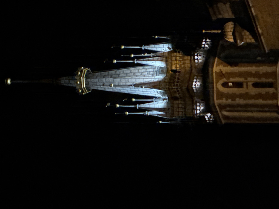 A nighttime shot reveals an architectural tower in the upper portion of the image