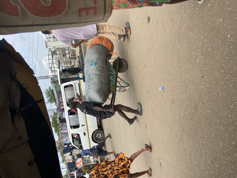 This image captures an active street scene within a market area in Onitsha, Nigeria