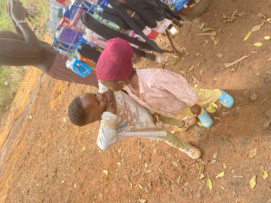The image depicts an outdoor scene in Ejule, Nigeria. In the foreground, two young children stand on reddish-brown dirt. A male child on the left, wearing a soiled light-colored "Wonder Woman" t-shirt, light-colored trousers, and pink Crocs-style sandals, places his left hand on the face/neck of a female child to his right. This female child wears a red head covering, a light pink striped long-sleeved shirt, yellow trousers, and blue Crocs-style sandals. Both children are looking at each other directly. To the right, a makeshift market stall displays various packaged consumer goods, including items labeled "TOTAL," "7 DAYS," "MYMY," and "Wig Hair," arranged in clear plastic structures. A third individual, partially visible behind the stall, has dark skin, is bare-chested, and wears light brown shorts. The ground is scattered with dry leaves and small debris. Green foliage is visible in the distant background under bright, natural daylight.