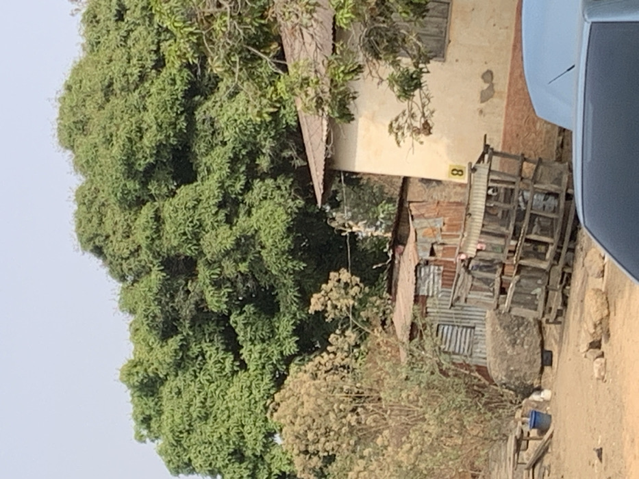 A sideways shot reveals a modest building with number 8 on its side, adjacent to a ramshackle structure. The latter appears to be constructed from corrugated metal, with a stack of wooden frames nearby. Lush green foliage dominates the left side, contrasting with the beige-toned building. A car partially occupies the right side, obscuring details. The ground appears sandy or dirt, typical of rural locations.
