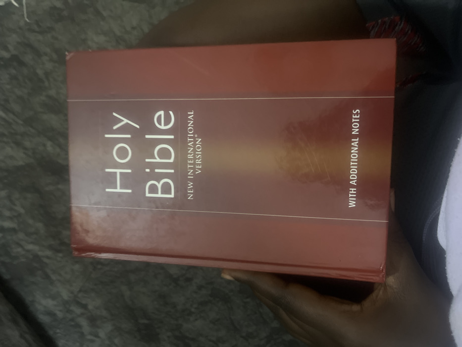 A red-brown hardcover "Holy Bible New International Version with Additional Notes" is depicted