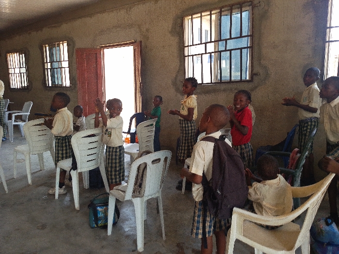 The image depicts an interior room in Unknown, Unknown. Approximately thirteen children, aged between 5 and 10 years, are present and engaged in an activity. Most children wear light-colored short-sleeved shirts and plaid skirts or shorts, indicative of school uniforms; one child wears a red shirt, another a green shirt. Several children are standing, clapping or holding their hands together, and smiling, facing forward, suggesting participation in a group activity. One boy in the foreground wears a dark backpack. A smaller child is seated on a white plastic chair, facing away. The room contains numerous white plastic chairs and one dark blue plastic chair. The walls are rough, unpainted concrete or plaster. Multiple windows with dark metal security bars and an open doorway with a reddish-brown frame provide natural light. The floor is plain concrete. A blue and green bag rests on the floor in the foreground.