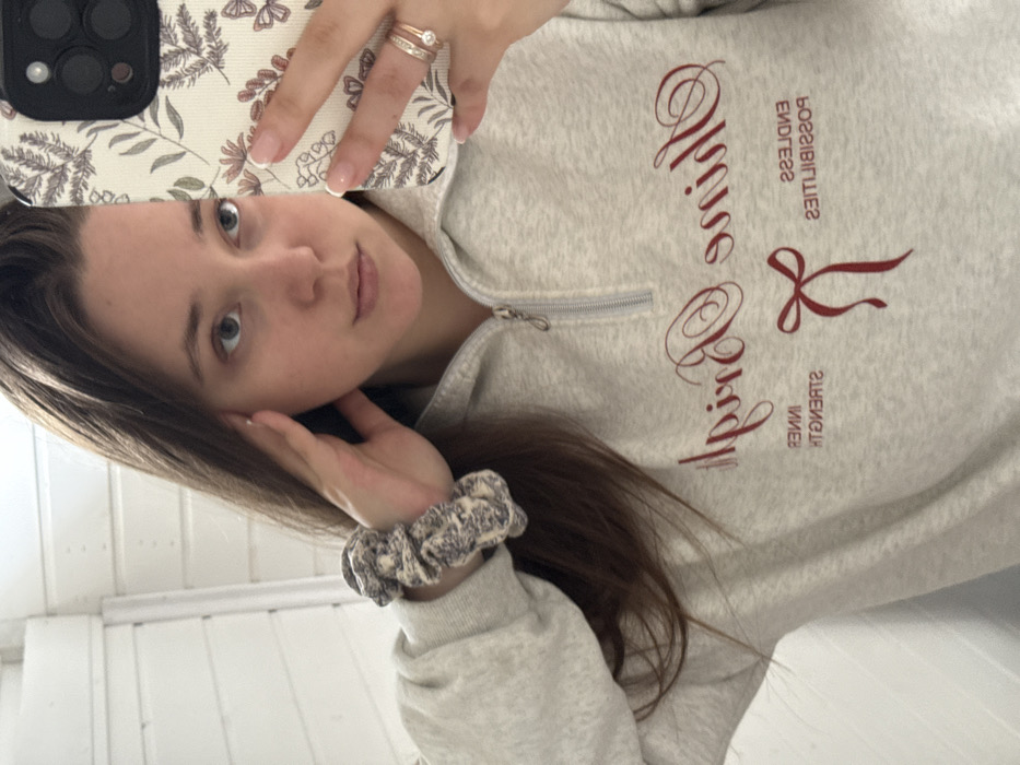 A young adult female is depicted in a mirror selfie, showcasing her upper torso and head in Starokorsunskaya, Russia. She has long brown hair and wears a light grey quarter-zip sweatshirt. The sweatshirt features red embroidered text, which appears reversed in the mirror, reading "tiriS eniviD" above "HTGNERT SRENNI" and "SEITILIBISSOP SSSEDNE," centered with a red bow graphic. A patterned scrunchie, blue/grey and white, is on her left wrist. Her right hand holds a smartphone with a cream-colored floral-patterned case, used to capture the image. Two rings, one plain gold band and one gold band with small stones, are present on the fourth finger of her right hand. Her left hand is raised, touching the side of her head. The background visible in the reflection consists of a light-colored wall with horizontal paneling. Her gaze is directed towards the camera lens.