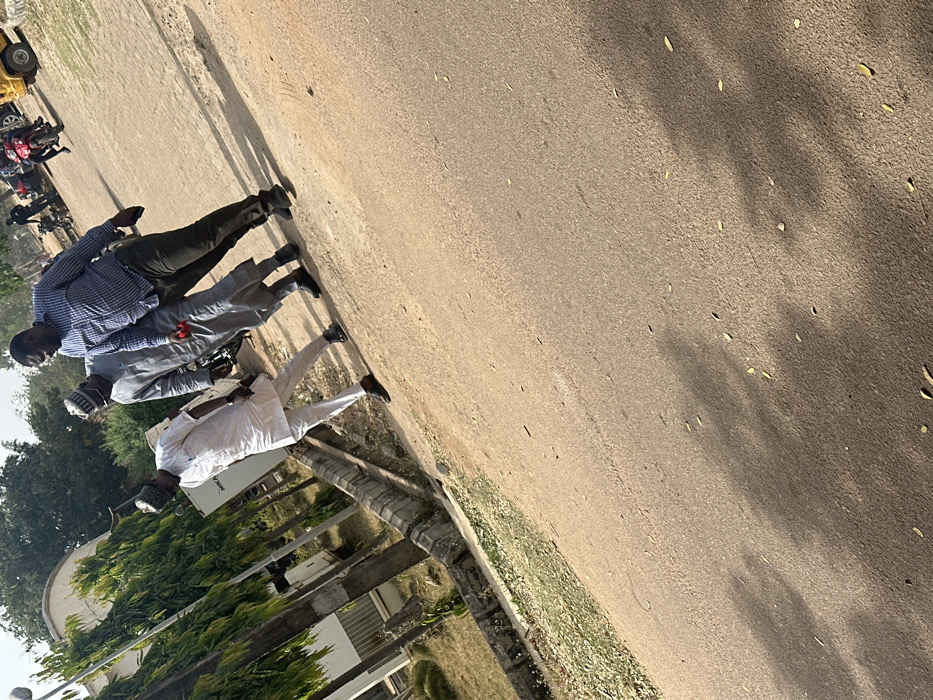 The image depicts an outdoor, daytime scene on an unpaved, light-brown road in Tudun Nupawa, Nigeria