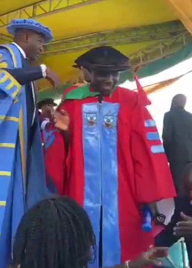 - "On a stage under a yellow awning, a man in a blue and gold academic gown shakes hands with two individuals dressed in red academic gowns with blue panels and black hats" by FM-jZXWt2, licensed under CC BY 4.0