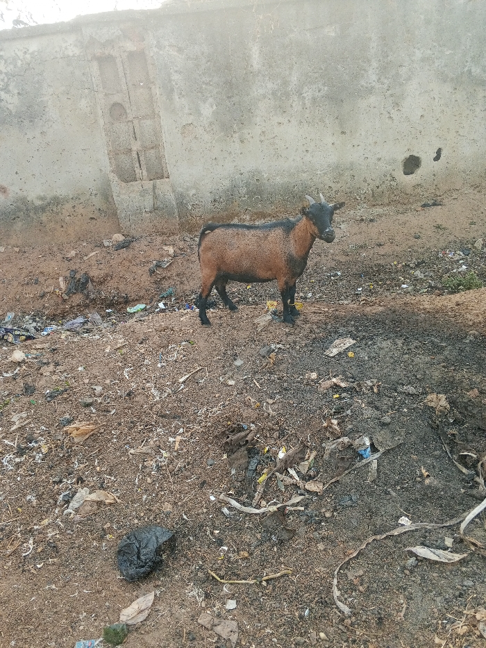 - "A lone goat stands in a littered dirt area beside a cement wall" by FM-KKBrm1, licensed under CC BY 4.0