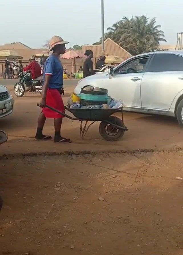 two people pulling wheelbarrows down a dirt road. The first person is wearing a blue shirt, red shorts, a hat, and sandals. The wheelbarrow is filled with dishes and other items. The second person is wearing a long, patterned dress and a headscarf. The wheelbarrow is filled with a large pot and other objects. The scene is set on a dirt road with cars and motorcycles parked nearby. There are buildings and people in the background. The atmosphere is busy and urban.