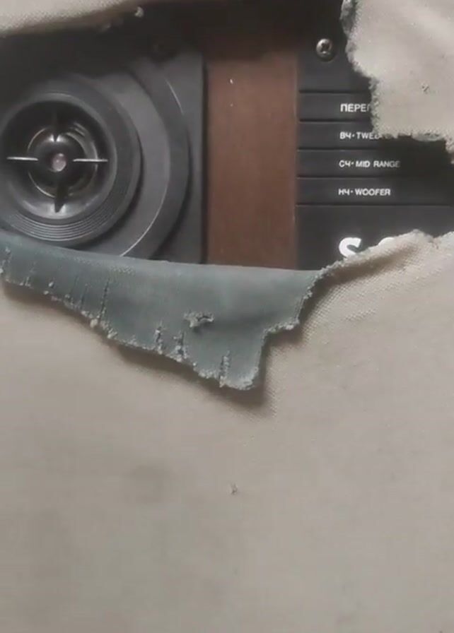 close-up of a loudspeaker covered in tattered tan fabric. A tweeter speaker is visible through a hole in the fabric. To the right of the tweeter is a wooden panel. Next to the wooden panel is a black panel with white lettering labeling the different speaker types as “TREBLE,” “MID RANGE,” and “WOOFER.” Music is playing in the background.