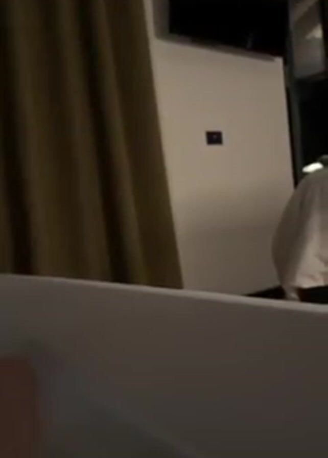view from inside a bathtub. The tub is white. The camera is positioned at a low angle, looking out into a dimly lit room. A dark green curtain is visible to the left. On the wall, there is a flat-screen television and a small dark switch. To the right, there is a bed with white linens. The room appears to be a hotel room. No people are clearly visible, though there is a blurry, reddish object visible within the tub.