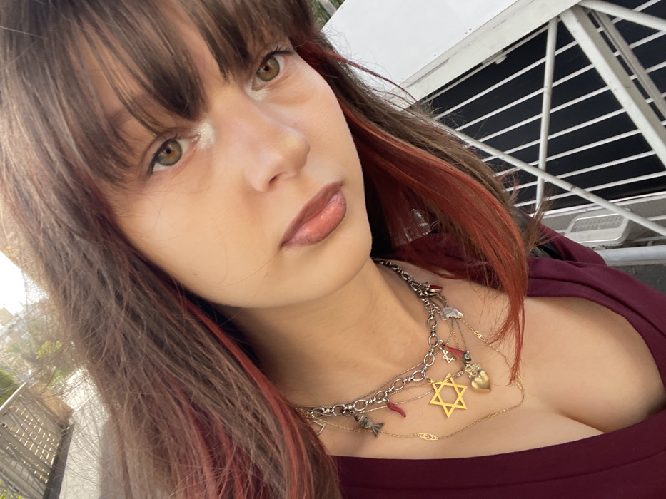A headshot and upper torso photograph of a young female subject is presented, taken outdoors in Kfar Saba, Israel. The subject has long, brown hair with red highlights and bangs. Her hazel eyes are directed towards the camera, and her head is tilted slightly. She wears a deep red V-neck top. Multiple layered necklaces are visible; a silver-toned chain features various charms, including a red chili pepper, a fish, and a hamsa hand. Below this, a gold-toned chain holds a large Star of David pendant, accompanied by another gold-toned chain with a rounded gold pendant, and a third thin gold chain with small geometric links. The background includes a brightly lit, white building structure with dark vertical and diagonal bars.