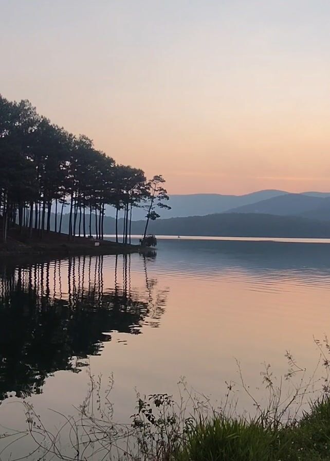 tranquil lakeside scene at dawn or dusk. The sky transitions from a pale pink near the horizon to a light blue overhead. The lake is calm with gentle ripples, reflecting the colors of the sky and the silhouettes of trees on the shoreline. A line of tall, thin trees stands along the edge of the lake, and their dark reflections are mirrored in the still water. In the distance, a range of hills is visible, fading into the hazy sky. Some vegetation and grasses are seen on the immediate shoreline in the foreground.