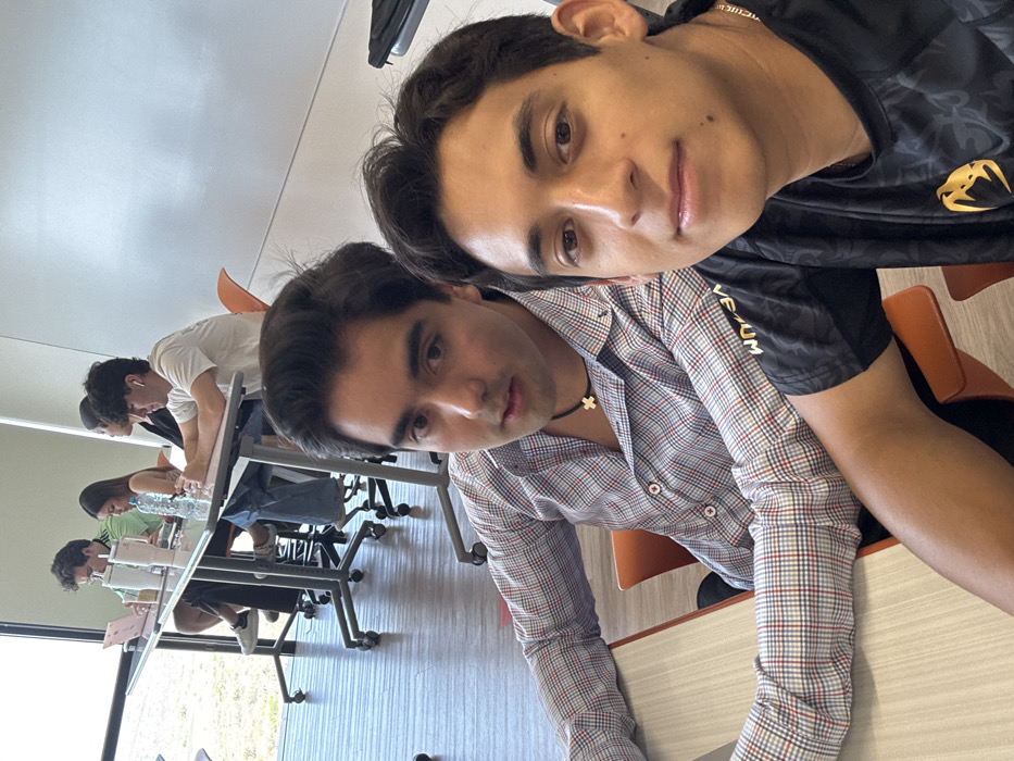A photograph depicts two young adult males in the foreground of what appears to be a modern educational or collaborative workspace in Fraccionamiento Los Heroes Queretaro, Mexico. The male on the left, with dark hair and a light complexion, wears a blue, red, and white plaid long-sleeved shirt with a black choker necklace featuring a small gold cross. He is seated at a light-colored desk with an orange chair and looks slightly to his right. The male on the right, also with dark hair and a light complexion, wears a black short-sleeved shirt with a gold "Venum" logo on the chest. He is positioned closer to the camera, appearing to capture the image, and looks directly forward with a slight smile. In the background, four additional individuals are seated at a long, rectangular glass-top table with metal, wheeled bases and orange chairs. From left to right at this table: a male in a green shirt is looking at a pink laptop next to a white tumbler; a female in a light-colored top is looking towards the right, with a clear water bottle on the table; a person in a dark top is partially obscured; and another male in a white shirt with white earbuds is looking towards the left. The environment features a light brown tiled floor, a plain white wall on the right, and large glass windows on the left that reveal an outdoor area with green vegetation under bright daylight. The overall scene suggests an active study or work session.