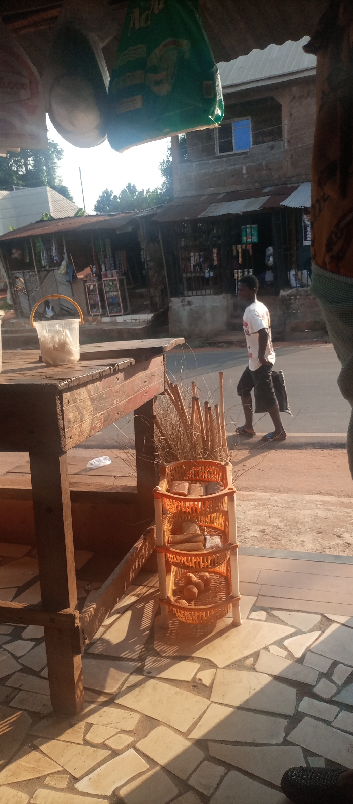 An outdoor scene shows a weathered wooden table to the left with a bucket on it. Next to the table, there's an orange plastic shelving unit containing food items. Behind these items, a person walks along a road, and two small buildings are visible across the road. The buildings have a cluttered appearance and a weathered aesthetic. The foreground displays a tiled floor with shadows.