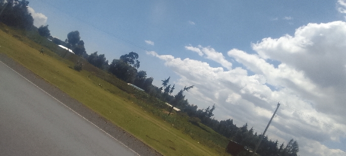 The image depicts a rural or semi-urban roadside landscape in Naivasha East ward, Kenya, captured with a tilted perspective. A two-lane asphalt road, delineated by a white edge line, diagonally traverses the lower left portion of the frame. To the right of the road, a wide, green grassy slope ascends towards the background. A solitary, distant human figure, rendered as a dark silhouette, is observed walking uphill on this grassy incline towards the upper left. Various trees, ranging from dense clusters to individual specimens, are scattered across the slope and form a treeline along the distant horizon. In the mid-ground, partially obscured by trees, a small, light-colored structure is visible on the grassy terrain. Scattered small, light-colored objects are present on the grass. A wooden utility pole, supporting multiple thin power lines, extends from the lower right towards the upper right. The upper section of the image features a bright blue sky adorned with numerous white cumulus clouds of varying sizes. The scene is illuminated by natural daylight.