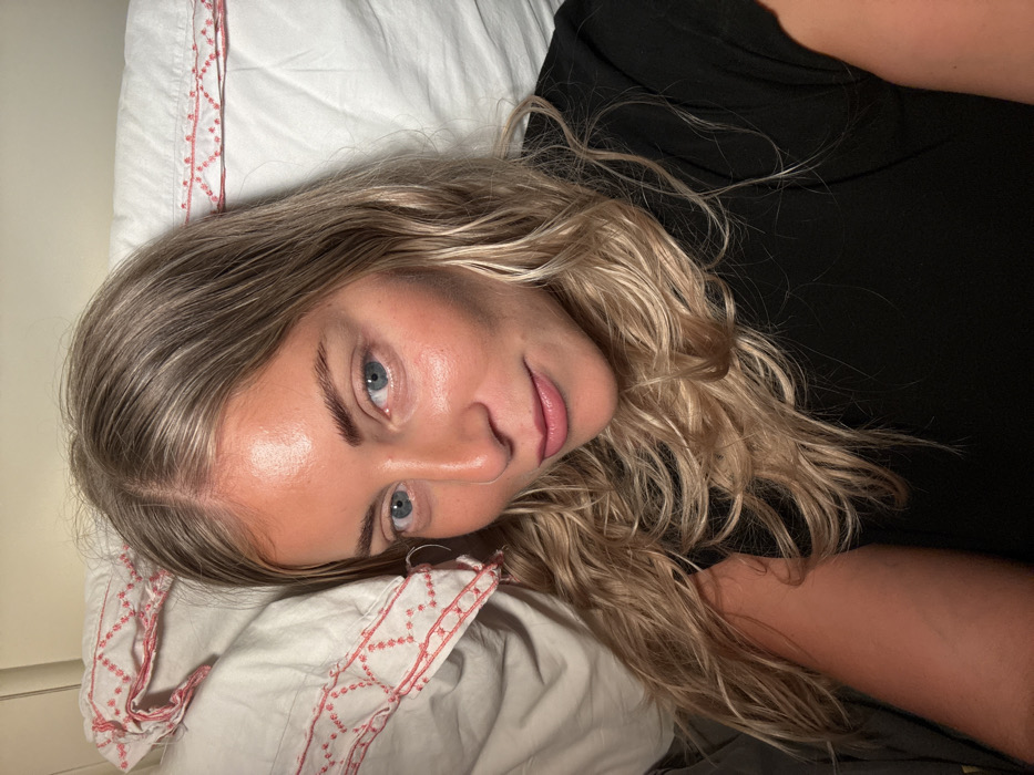 A close-up, slightly high-angle image depicts an adult female subject in an indoor environment, specified as Wattrelos, France. The subject has long, wavy blonde hair with a subtle part on her left side, blue eyes, and a tanned complexion. Her lips are a light pink. She wears a black short-sleeved garment and looks directly at the camera. Behind her head, a white pillow featuring a red embroidered geometric pattern is visible on the left. A plain white pillow is partially visible on the right. The scene is lit by artificial light.