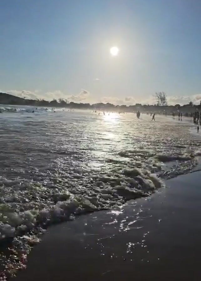 sunny beach scene. The sun is high in the clear blue sky, reflecting brightly on the water. Waves are gently lapping on the sandy shore. There are people in the water and on the beach, some swimming and others walking along the shoreline. The overall impression is one of a pleasant, sunny day at the beach.