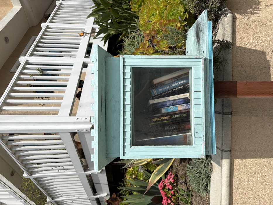 - "The image displays a light turquoise Little Free Library box positioned on a brown wooden post in a garden setting in Manhattan Beach, United States of America" by FM-RpOXy1, licensed under CC BY 4.0