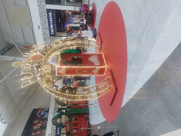 The image depicts an indoor scene within a shopping mall in Noyelles-Godault, France, characterized by festive holiday decorations