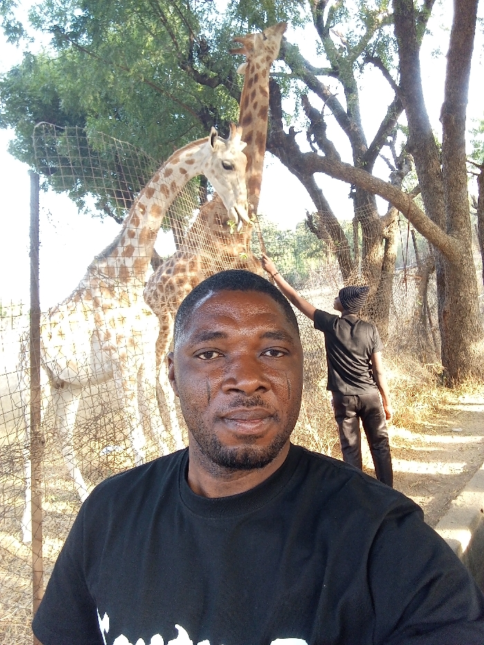 A selfie shows a man in a black t-shirt in the foreground. Behind him, two giraffes are eating leaves, enclosed by a wire fence. A second person, wearing dark clothes and a hat, stands near the fence, possibly feeding the giraffes. Trees and foliage are visible in the background, adding depth to the outdoor setting. The image has a bright, sunny quality.