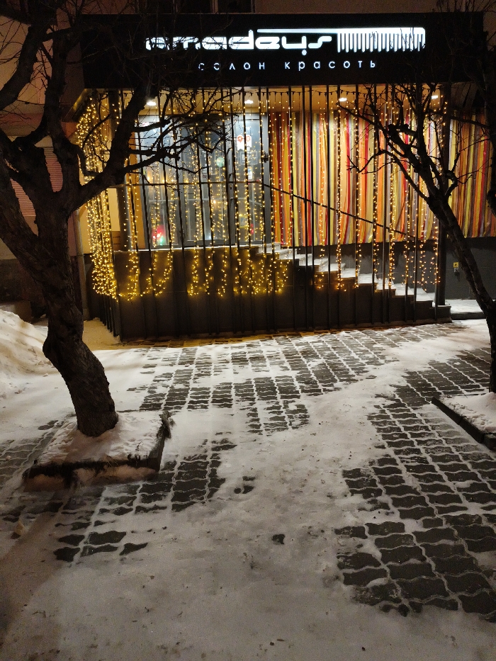 A nighttime view reveals a snow-covered brick walkway leading to a brightly lit business. Bare trees flank the scene. A sign in a foreign language is visible above a window with vertical lines of colorful fabric. Strings of lights decorate the building's front. The ground is a mix of snow and visible brick patterns.