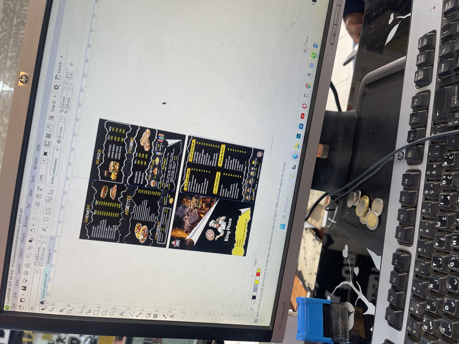 The scene depicts a dusty workstation located in Meknes, Morocco, captured from a slightly elevated, angled perspective. A prominent HP Compaq LA2206 computer monitor displays CorelDRAW 2021 (64-bit) software. The active document, "menuu grilled.cdr," presents a digital design for a food menu, characterized by a black background with yellow text and graphical elements. The menu includes categories such as "SANDWICHS," "BURGER," "ASSIETTES," and "PANINIS," featuring illustrative food images (e.g., burgers, grilled meat, pizza) and prices specified in Moroccan Dirham (DH). A "King Pizza" logo, depicting a chef holding a pizza, is visible on the lower left of the menu design. In the foreground, an Arabic/French keyboard, visibly marked by dust and grime, occupies the lower portion of the frame. To the immediate right of the keyboard, a small pile of assorted Moroccan Dirham coins (including denominations of 1, 5, and 10 DH) rests on the dark, possibly black, desk surface. A blue self-inking stamp, bearing the "MakStamp" brand, is positioned on the left side of the desk. Black electrical cables are observed traversing the desk surface. A partial view of a person's arm, wearing a blue sleeve, is visible on the far right edge of the frame, indicating human presence. The background beyond the monitor is blurred, suggesting an indoor office or design studio setting.