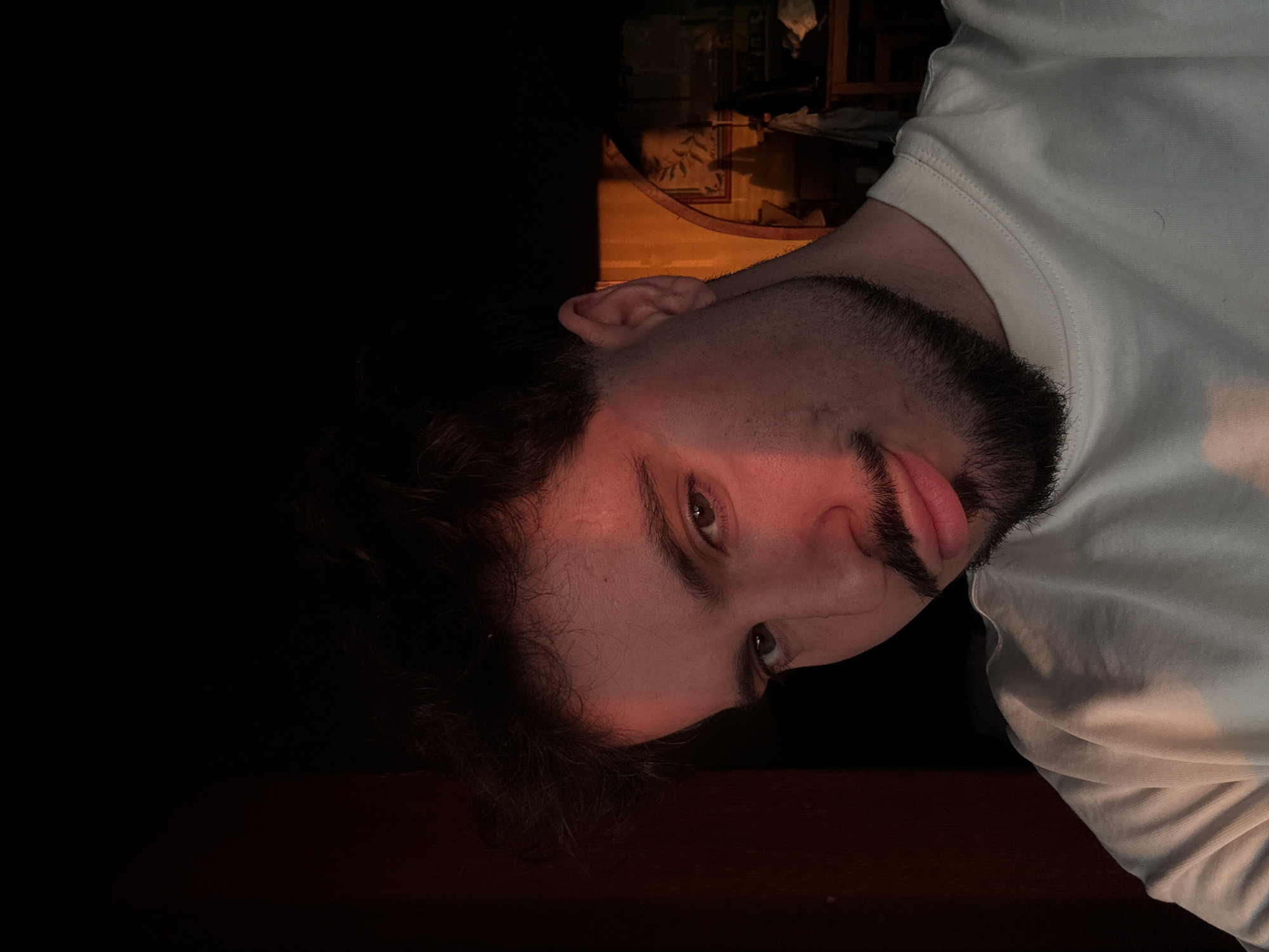 The image depicts a head-and-shoulders portrait of a young adult male in an indoor setting in Vila Nova de Gaia, Portugal. The subject has dark, curly hair, light skin, dark eyes, and a mustache connected to a goatee beard. He is wearing a light-colored, possibly off-white, long-sleeve crew-neck shirt. He faces forward, looking directly into the camera with a neutral expression, exhibiting a subtle upward curve at the left corner of his mouth. A strong, warm reddish-orange light source, likely from the left, illuminates the left side of his face, hair, and shoulder, casting the right side into deep shadow. The background is largely dark and out of focus. On the subject's right, an arched opening is partially visible, with a dimly lit framed picture featuring a floral design on the wall beyond, and indistinct furniture and objects below. The left background is a plain, dark surface.