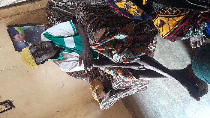 An indoor scene in the city of Karshi, Nigeria, features an elderly individual with dark skin, seated in a patterned armchair