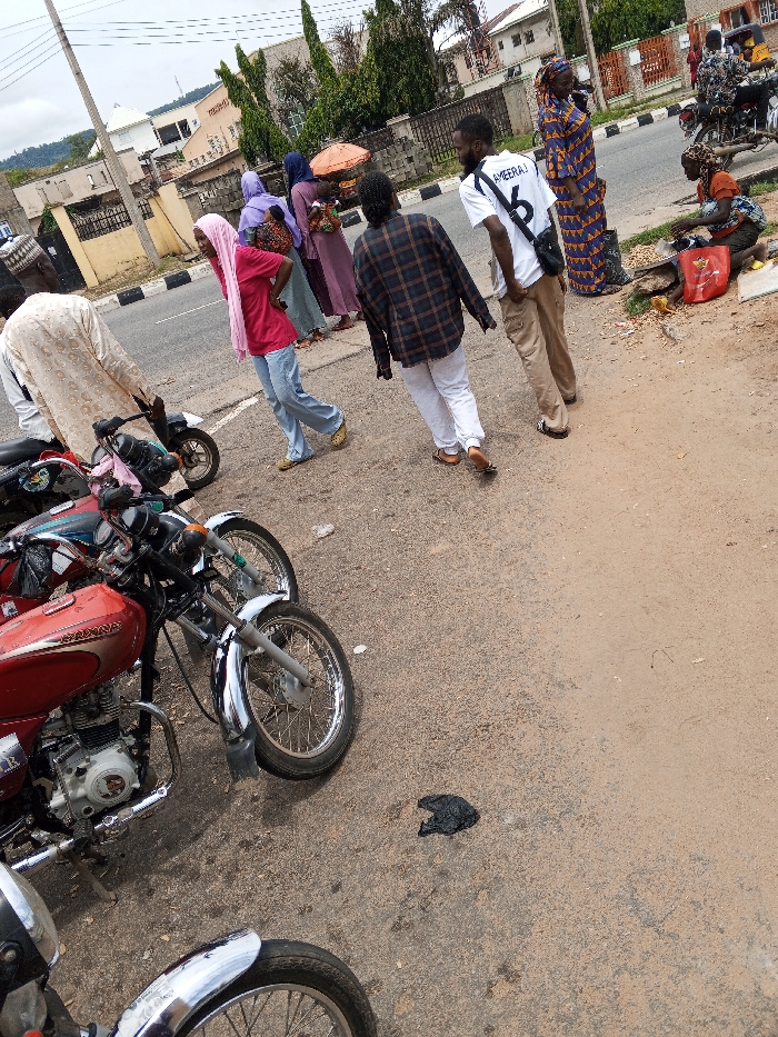 This image captures a street scene in Lokoja, Nigeria, characterized by human activity, parked motorcycles, and roadside vending