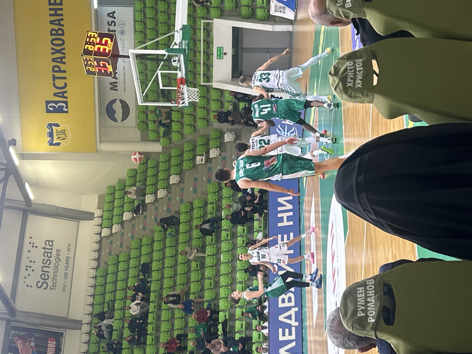 An indoor basketball game is actively underway at OZK Arena in Botevgrad, Bulgaria, viewed from a spectator perspective