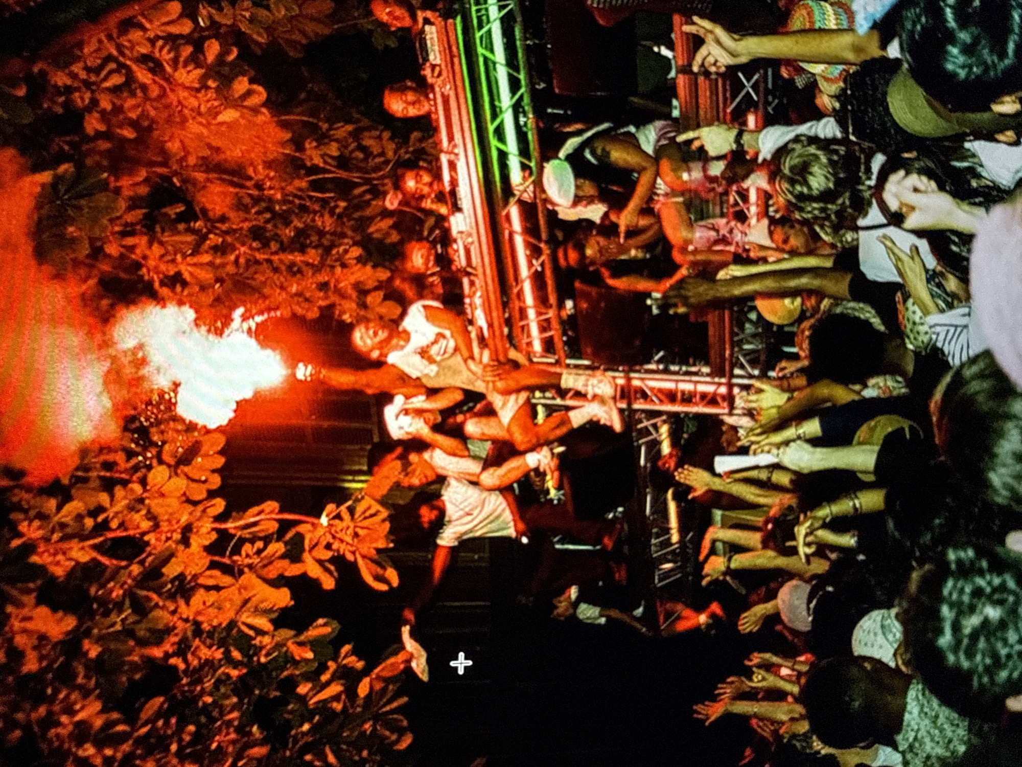 The image depicts a vibrant, energetic scene at a nighttime event. The location appears to be North Kuta, Indonesia, indicated by the foliage. A performer in a white shirt and shorts is being held up by others in what seems to be a crowd-surfing motion above a crowd of outstretched arms reaching towards him. Another person appears to be holding a flamethrower or similar pyrotechnic device, creating a large plume of white fire against a backdrop of trees. Behind the performer and crowd, there is scaffolding. Green and red lighting effects illuminate the scene.