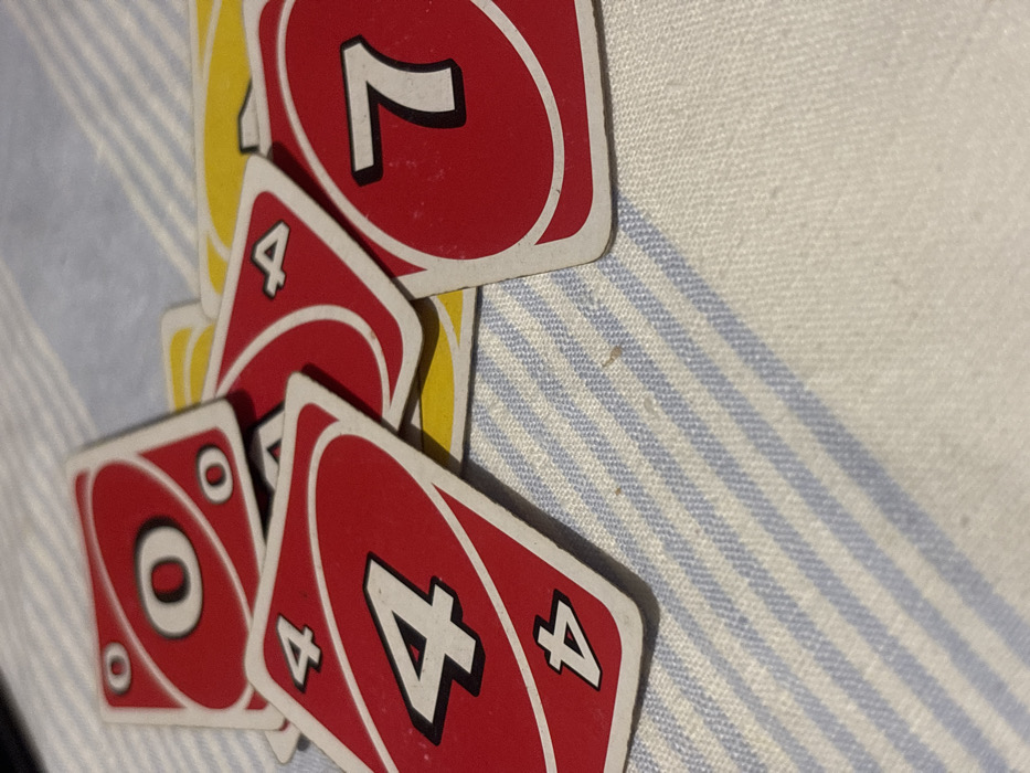 - "The image depicts a close-up, elevated view of multiple UNO playing cards scattered and overlapping on a fabric surface" by FM-2g8Zp2, licensed under CC BY 4.0
