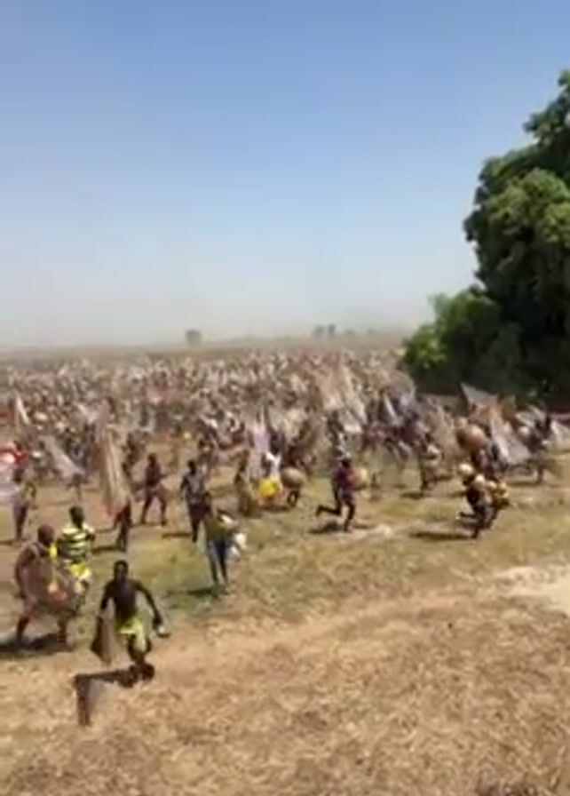 large crowd of people gathered in a field under a clear, blue sky. The field appears dry and grassy. Many people are wearing traditional clothing, with some carrying drums and others carrying nets. There is a noticeable amount of dust in the air, partially obscuring the background. Some individuals are running, and the overall impression is one of a lively and possibly ceremonial event. A large tree stands on the right side of the frame, providing a visual landmark.