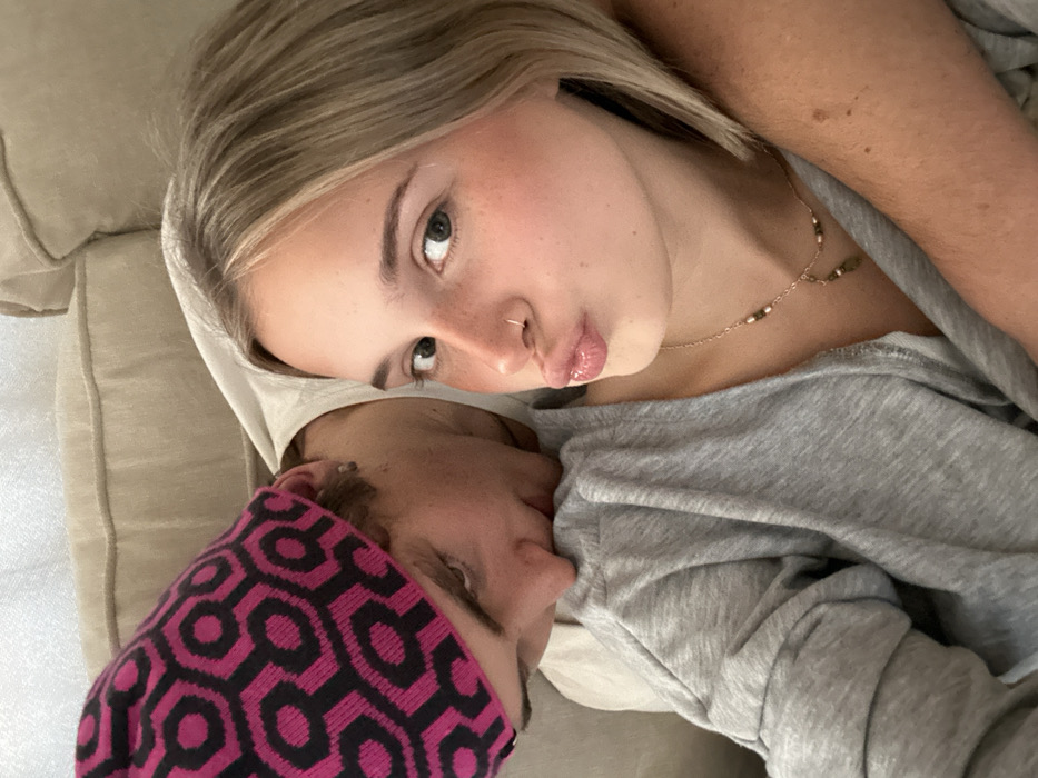 The image depicts two young adults, a female and a male, in a close-up, selfie-style photograph taken indoors, likely within a private residence in Kingston, Canada. **Subjects:** 1. **Female (foreground, right):** Possessing light-toned skin and shoulder-length blonde hair, she directly faces the camera with a "duck face" expression, her lips glossy and pursed. Her eyes are light-colored. A small silver hoop nose ring is visible on her left nostril. She wears a light grey V-neck, long-sleeved top and a delicate gold chain necklace with small dark beads and two green teardrop-shaped pendants. Her right arm is visible, wrapped around the male. 2. **Male (background, left):** Also with light-toned skin, he wears a black beanie with a repeating bright pink hexagonal pattern. A small silver stud earring is visible in his left ear. He is dressed in a light beige, possibly collared, top. His head is angled away from the camera, with his nose and mouth pressed into the female's left shoulder/upper chest area. His left eye is partially visible, glancing towards the camera. **Actions and Interactions:** The female holds the camera, capturing the selfie. The male rests his head intimately on her shoulder, appearing to nuzzle or kiss her. The female's arm is wrapped around the male, indicating a close physical interaction. **Environment:** The background reveals a light-colored, possibly beige or tan, upholstered sofa or armchair, indicating an indoor, casual setting.