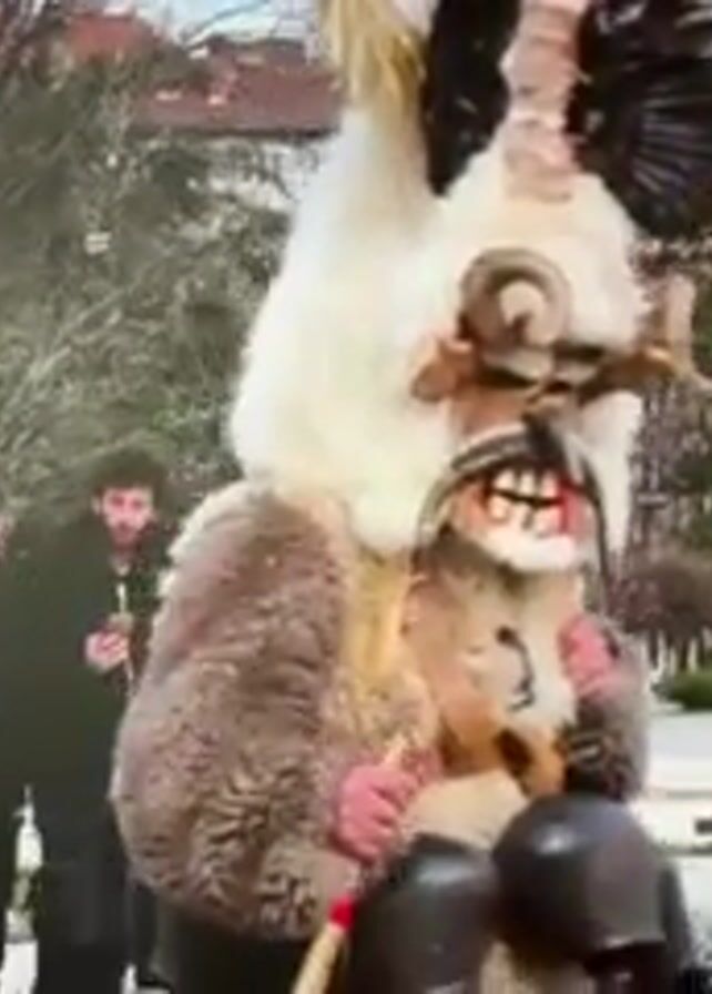 group of people dressed in elaborate, furry costumes with large masks, similar to traditional Bulgarian Kukeri costumes