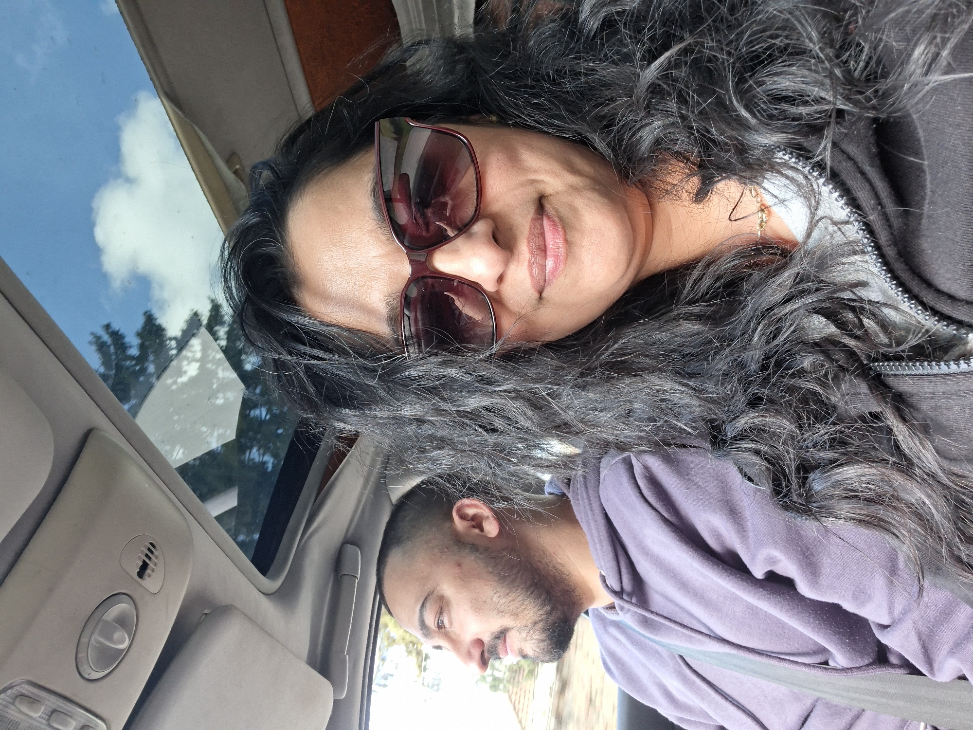 A portrait-style photograph depicts two individuals inside a vehicle with an open sunroof, revealing a view of the sky and trees. The woman, positioned closer to the camera, is wearing sunglasses and a dark-colored jacket over a light gray top. She has long, dark, curly hair. The man, situated in the background, is wearing a light purple hoodie. The vehicle's interior is visible, showing the sunroof controls and lining. Outside the vehicle, a blurred background suggests an urban or suburban environment, but without clear details, it is not possible to confirm if the location is in Sevlievo, Bulgaria. The people in the image appear to be relaxed and casual.