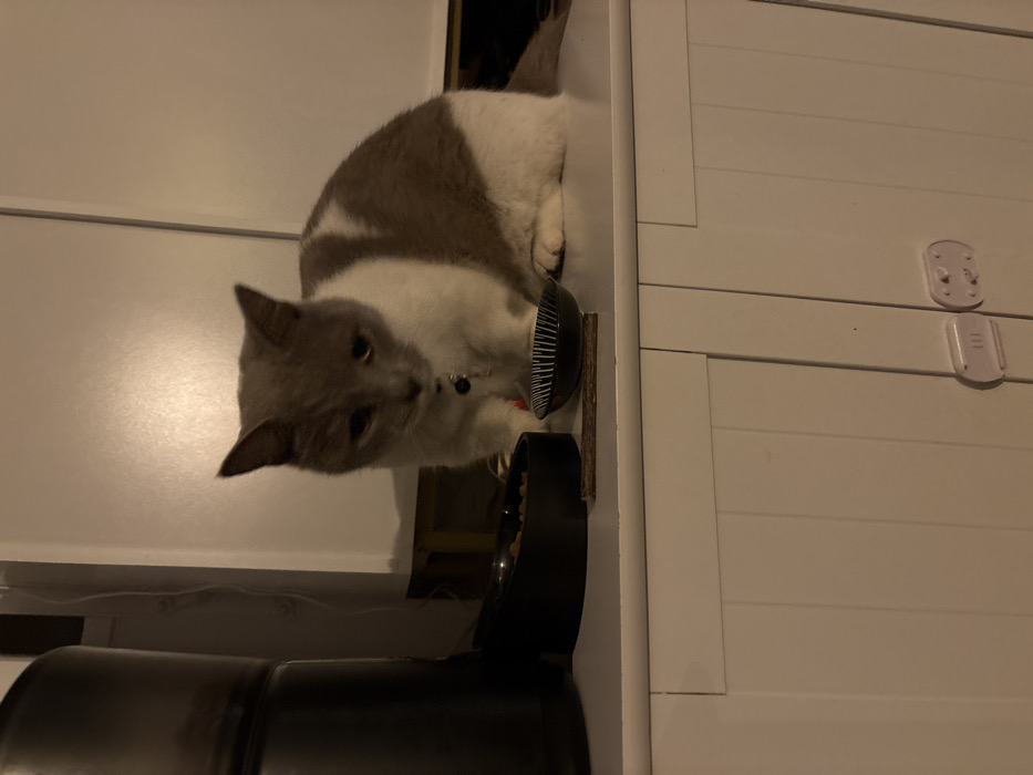 - "A domestic cat, presenting a grey and white bicolour coat, is positioned centrally on a white wooden cabinet or countertop" by FM-lMGvq1, licensed under CC BY 4.0