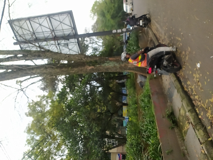 The image depicts an urban roadside scene in Bandung City, Indonesia, under diffused daylight conditions. In the mid-ground, a male individual is seated stationary on a black scooter with red accents, facing towards the right. He wears a light-colored helmet, a bright orange safety vest over a dark shirt, and light-colored pants, with his left foot on the ground. The scooter is positioned on the edge of an asphalt road, adjacent to a concrete curb and a sidewalk scattered with dry, yellowish-brown leaves. To the left of the road, a raised concrete planter contains dense green foliage. Beyond this planter, a blurred building with white and blue architectural elements is partially visible. In the background, further down the road, another individual on a dark-colored scooter is observed, along with a white van. A prominent, large, empty billboard structure, revealing its metal framework and white backing, stands on the right side of the frame, positioned behind a tree. Numerous trees with varying leaf densities are present throughout the background and mid-ground, forming a significant green canopy within the urban setting.