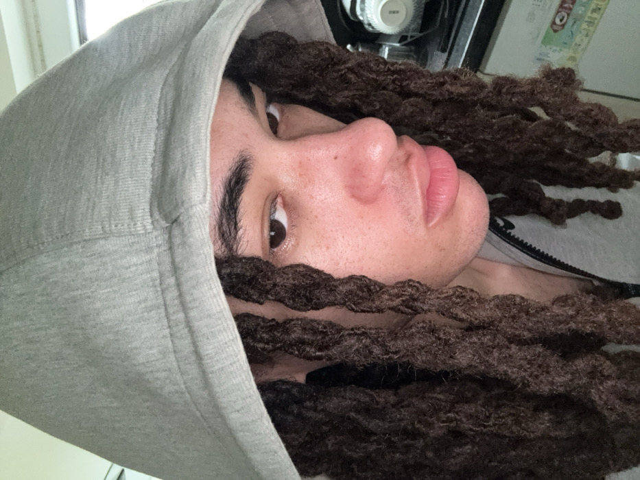 The image presents a close-up, head-and-shoulders portrait of a single individual, positioned within an indoor environment in Les Ulis, France. The subject is a young adult with light to medium brown skin, visible freckles on the cheeks and nose, and dark brown dreadlocks that frame the face and extend downwards. The individual wears a light grey hooded sweatshirt; the hood is pulled over the head, partially covering the forehead and ears. A black zipper is visible at the center front of the sweatshirt, and a faint white Nike swoosh logo is present on the left chest area. The subject's dark eyes are directed towards the camera, with the left eye slightly narrowed. The nose is prominent, and the lips are full and pursed. The background is out of focus but appears to be a domestic setting, with indistinct light-colored walls or surfaces and a darker counter-like surface on the right side. A white object, possibly a cup or container, is partially visible on this surface, along with a sticker featuring green and white elements. The lighting is diffused and even, consistent with an interior space.