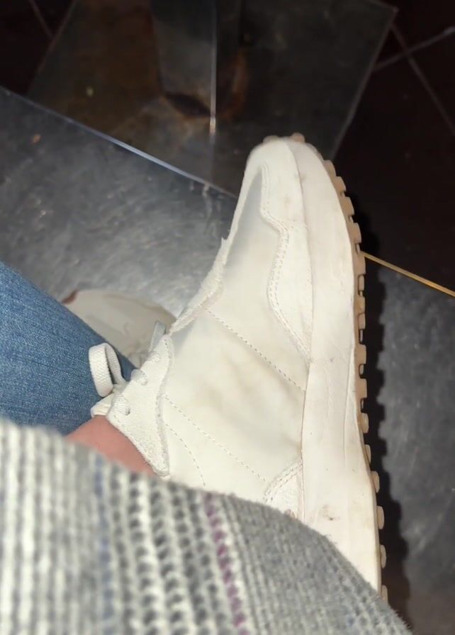person sitting with their right leg crossed over their left. The right leg is wearing a blue jean, and on the foot is a white sneaker. The person is wearing a gray and purple plaid coat or blanket. The person appears to be indoors, in what may be a bar or restaurant. A silver table is in the background.