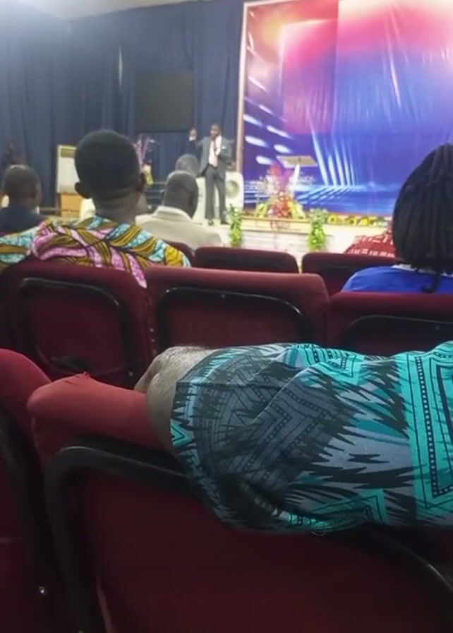 A person sits in a red chair, wearing a turquoise shirt with a geometric design, while listening to a speaker on stage in a large hall. The speaker, dressed in a suit, stands behind a podium with floral arrangements, gesturing with his hand. Behind him is a backdrop featuring light rays and abstract designs. Other attendees are visible in the foreground, seated in red chairs, with their backs to the camera. A small screen is mounted on the wall to the left of the stage.