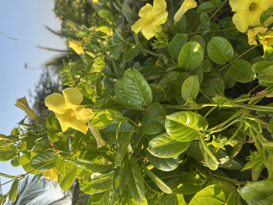 Lush greenery with vibrant yellow flowers dominate the frame. The leaves, mostly smooth and rounded, are illuminated by the sun, creating bright highlights. The blooms showcase a trumpet-like shape, adding a pop of color amid the foliage. The photo captures the essence of a warm, sunny day.
