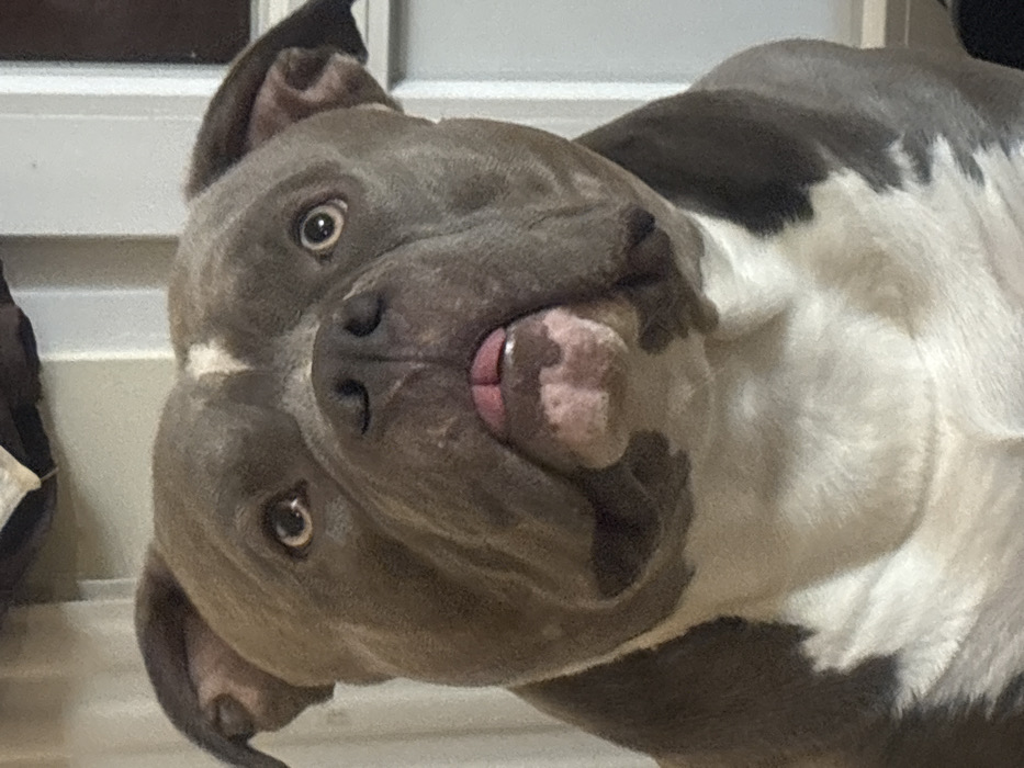 A gray and white American Bully dog lies on its back, its face tilted towards the camera. The dog's tongue slightly protrudes from its mouth. One ear is bent down, while the other is partially visible. The dog's eyes are wide and alert. The background features a blurry white wall and a hint of a dark object to the left.