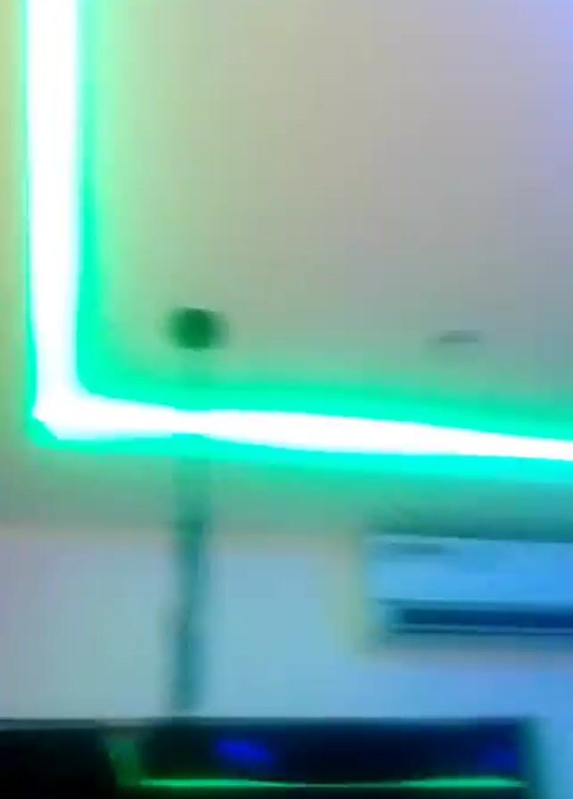 room with a modern ceiling design. There are curved recesses in the ceiling, outlined with blue LED strip lights. A straight line of green LED lighting runs along the lower part of the ceiling. There is an air conditioner mounted high on the wall. A unicycle hangs from the ceiling. There is a chandelier hanging from the center of the ceiling. A glass door is visible in the background.